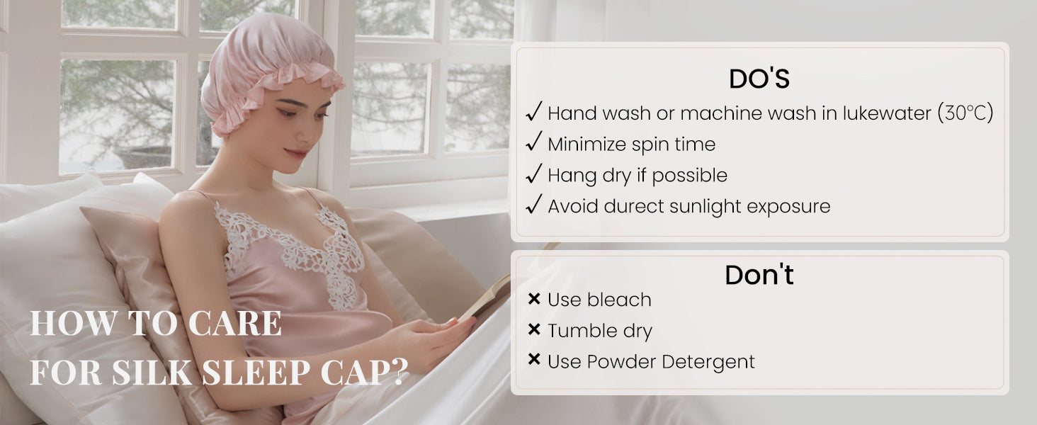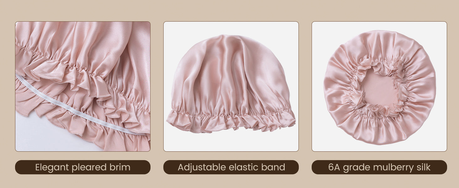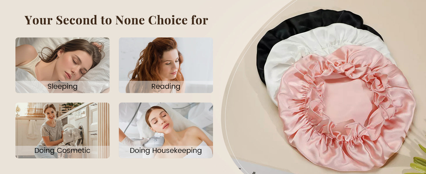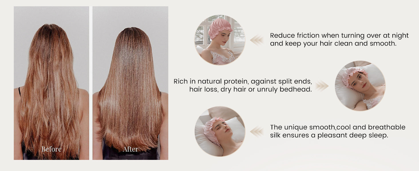 This silk night cap provides maximum hair protection and prevents tangles. It also locks in moisture and adds shine to hair. Also, the cap is very soft and gentle on your hair, it can prevent your hair from drying, breaking, and falling off overnight. So you wake up each morning with hair soft and gorgeous, and our night cap is soft enough to wear to sleep.