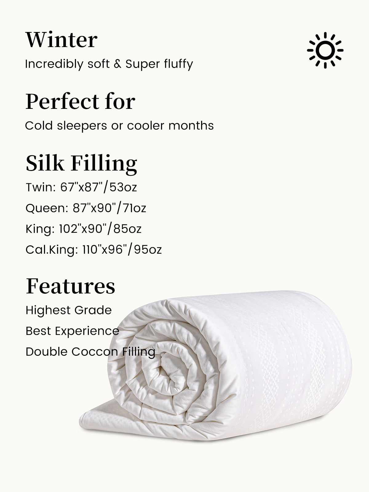 • Inner Filling:100% Double Cocoon Mulberry Silk (also known as 7A) - the most premium grade of silk