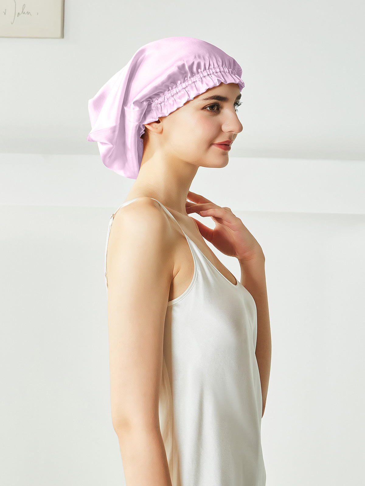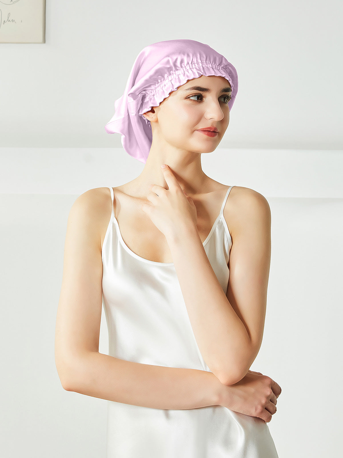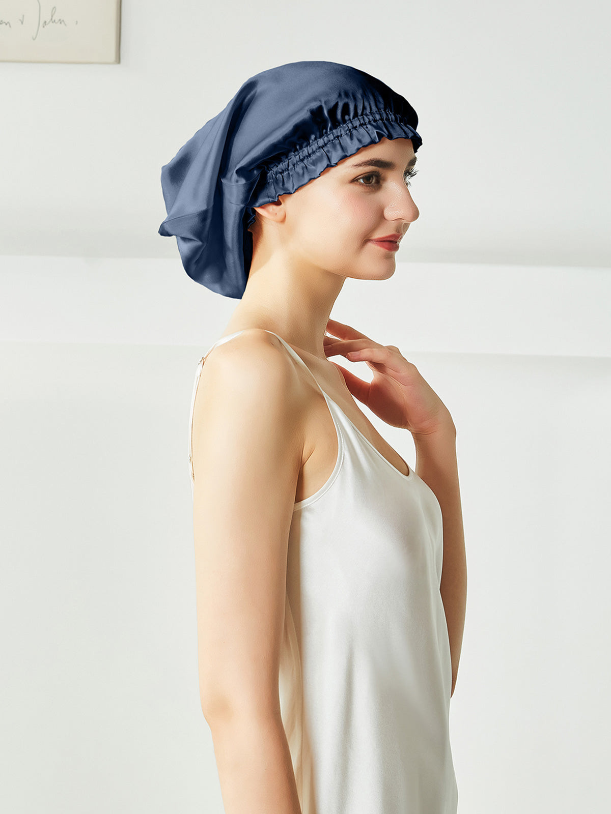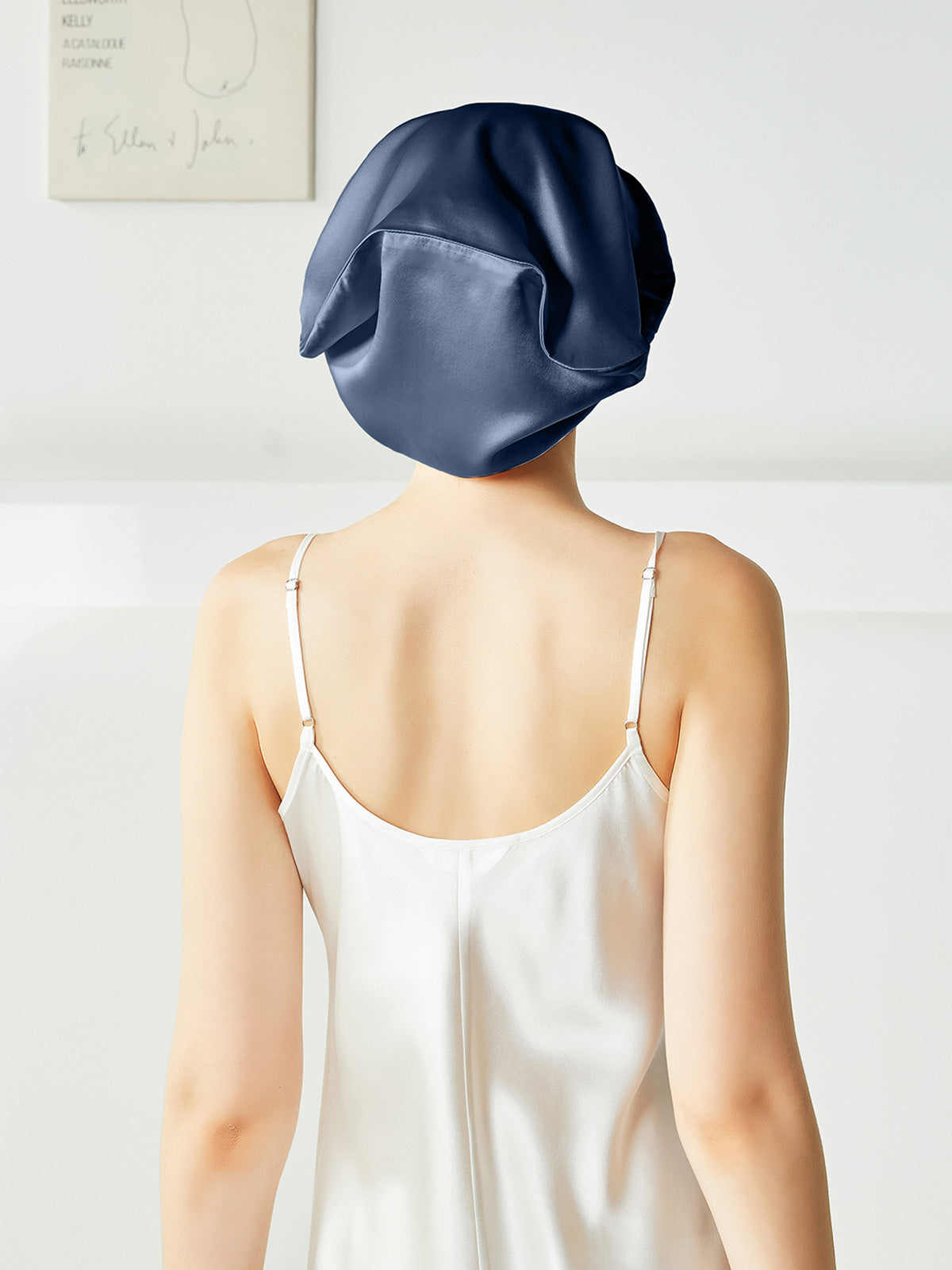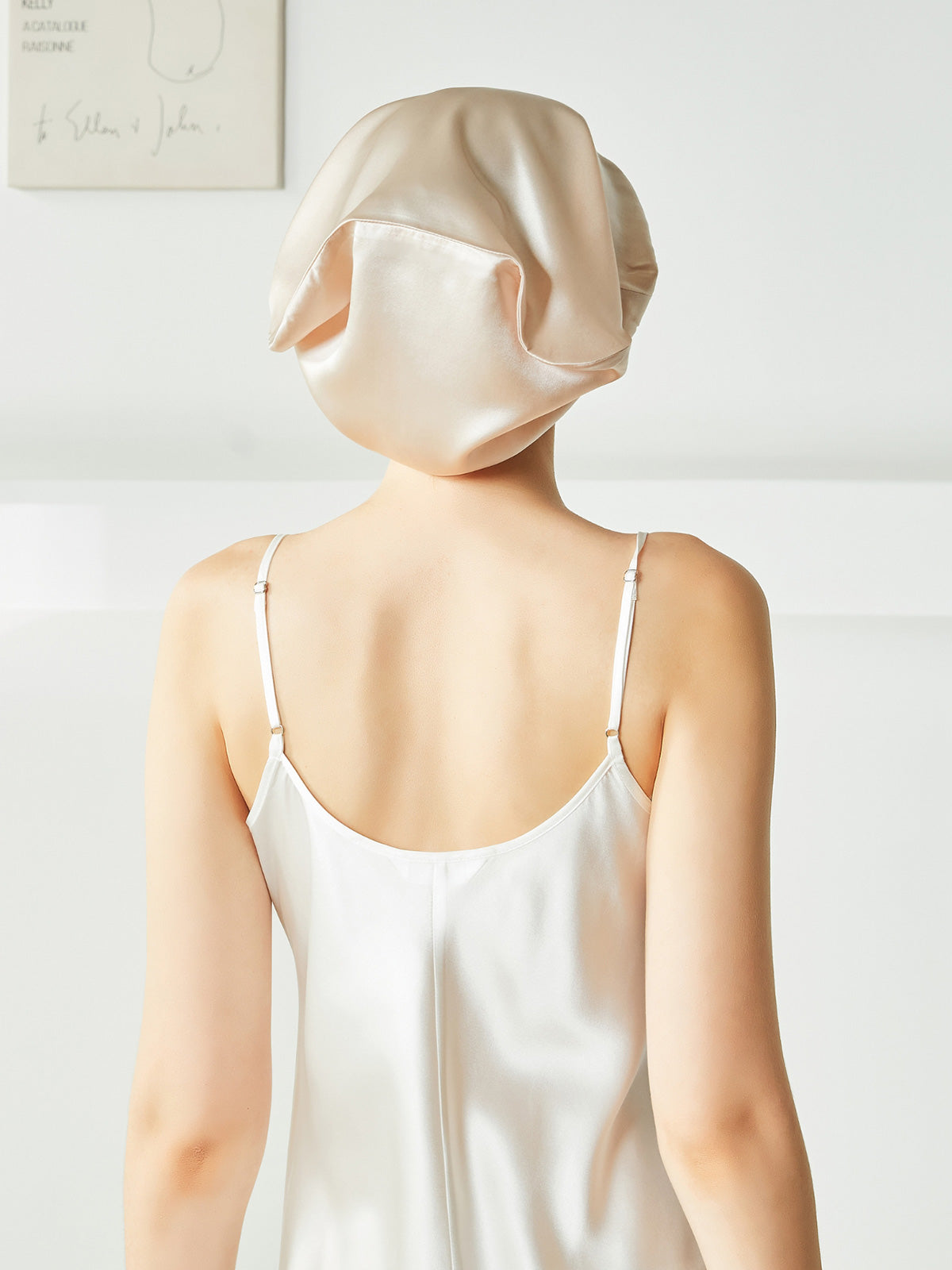 This is a pure silk sleep bonnet. You can be put your hair in the nightcap very relaxedly, instead of being folded on the head like the short nightcap, it can be easily worn on the head before going to bed. Silk can effectively keep the hair properly hydrated, not frizzy, and is beneficial for the hair.