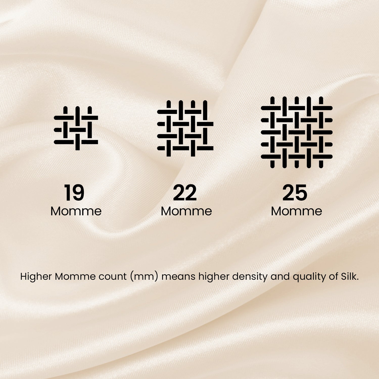 Momme (mm) is the unit that measures silk's weight and density (grams per square meter). A higher momme means a thicker, heavier, and more durable fabric. Typical silk pillowcases are 19-22 momme. Our 25 Momme construction is exceptionally substantial and hard-wearing, designed to withstand years of use without losing its luxurious integrity or protective benefits.