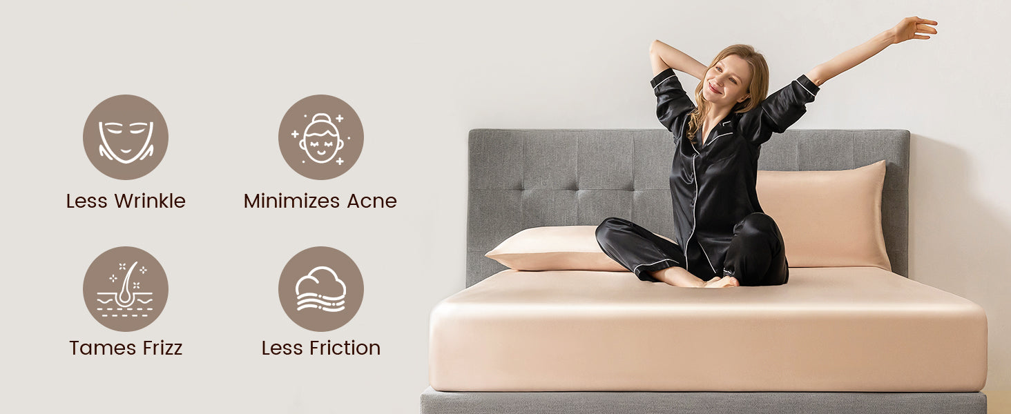 100% pure mulberry silk on both sides for comfort and aesthetic purposes.Soothes hair and skin. Enjoy hassle-free hair and anti-aging skin care. Helps skin stay hydrated while you slumber and prevents against the bedhead.