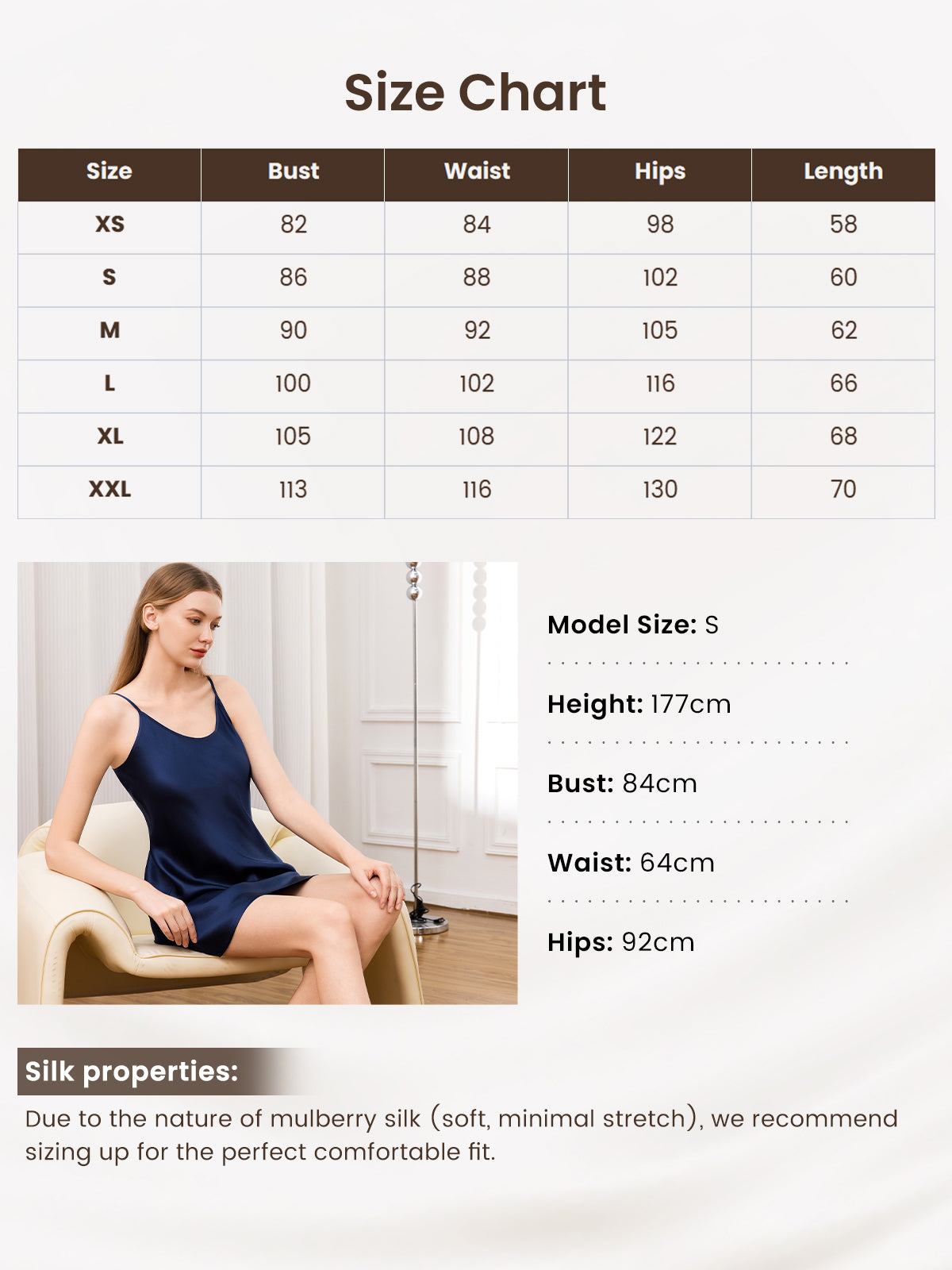 Soft and light as feathers, with exceptional cutting and adjustable shoulder straps, the silk nightgown looks elegant and better looking when wearing it. This silk dress can touch the skin directly and is very soft; you can even wear it as lounge wear. So it must be your best choice as the silk nightdress is excellent for any occasion.